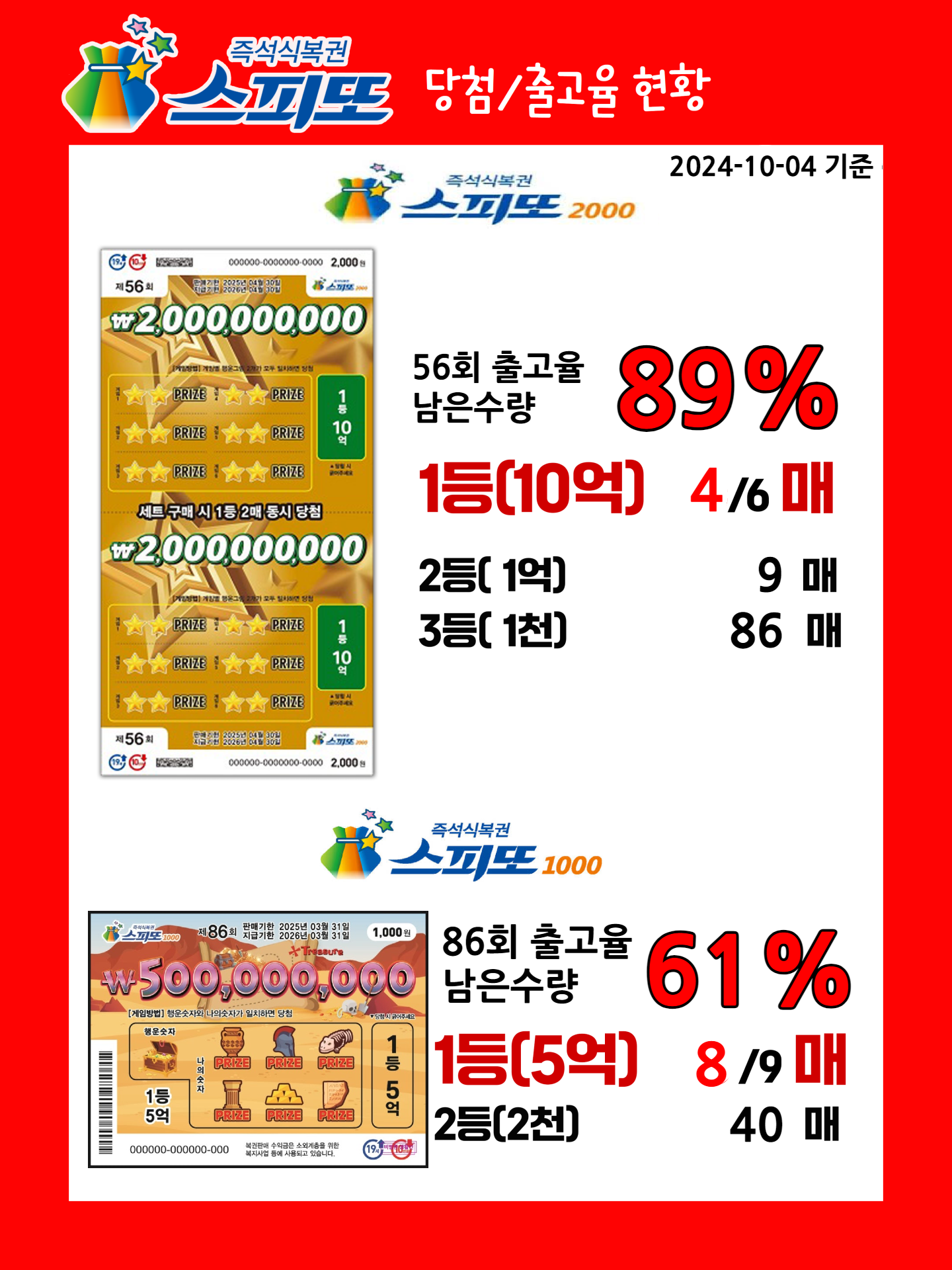 현재 스피또2000 56회 출고율은 89%이며 1등은 6매중에 4매가 남았습니다.