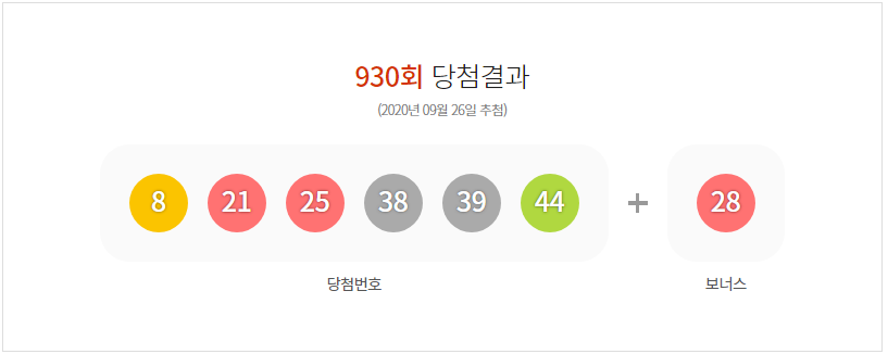2020년 09월 26일 로또 930회 당첨번호가 발표되었습니다.